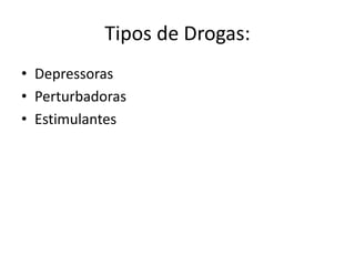 Embora seja uma droga frequentemente o álcool não é considerado como tal principalmente pela sua grande aceitação social e mesmo religiosa. Existen diversos tipos de drogas depresoras están clasificadas según los efectos que causan y la gravedad de dependencia entre ellos encontramos a los siguientes. As drogas são diferentes entre si e é importante saber o que cada uma delas provoca.